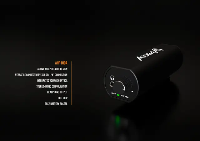 Sua configuração estéreo/mono por meio de um seletor interno permite que o AHP100A se adapte facilmente a uma variedade de configurações. Com uma saída para fones de ouvido via mini conector estéreo de 1/8", ele oferece uma experiência auditiva incomparável.