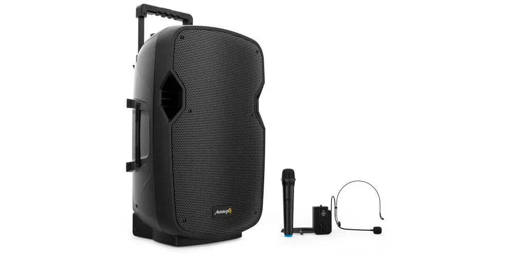 Caixa de som PA Trolley de 15" com rodas e bateria + 1 microfone de mão + 1 fone de ouvido Audibax Denver PORT15 VHF Plus