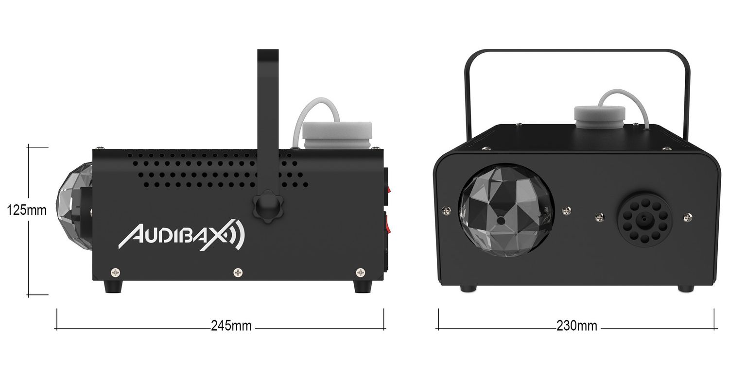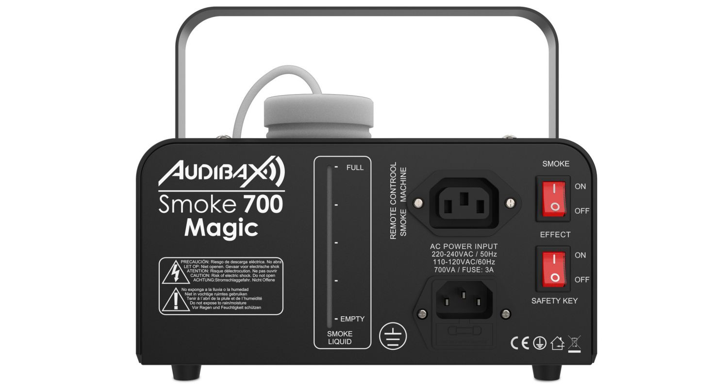 A Audibax Smoke 700 Magic é uma máquina de efeitos dois em um, composta por uma máquina de fumos em combinação com uma Jelly Ball LED que cria uma excelente produção de fumo com efeito LED, sendo a opção ideal para eventos em pequenas salas, bares, discotecas ou mesmo em casa. A nossa máquina de nevoeiro Smoke 700 Magic está equipada com 3 luzes LED RGB com um efeito dinâmico de 3W de potência, graças às quais são criados rapidamente efeitos de luz impressionantes e surpreendentes. Acompanha controle remoto e tanque de fluido embutido, com capacidade para 250 ml. Seu tempo de aquecimento é de 5 minutos. Especificações