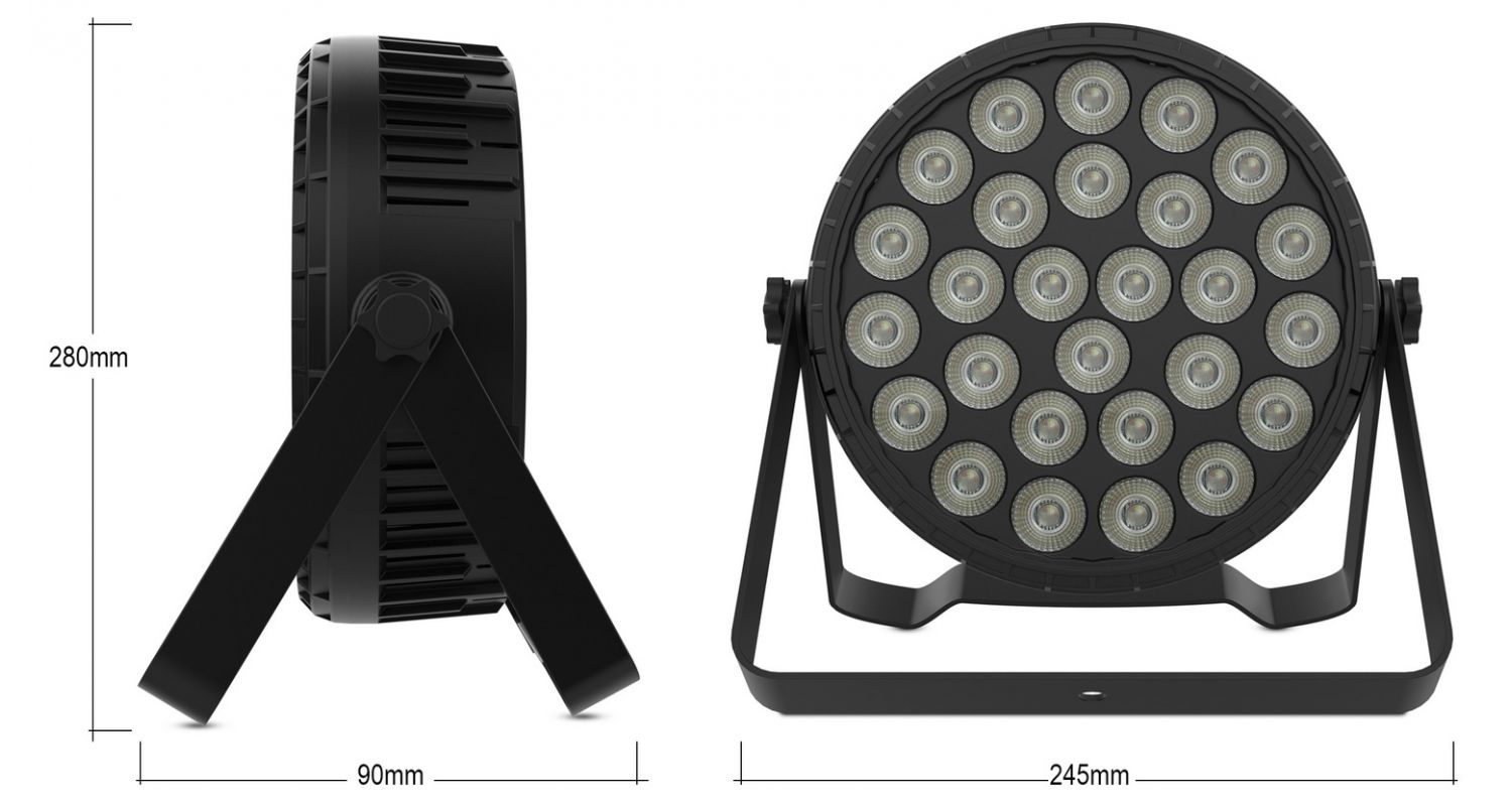 Potência: 120W Fonte de luz: 27 x 6W RGBW 4 em 1 LED Lente: 15º Canais DMX: 4/8 canais Modo de controle: DMX512, master-slave, AUTO, som Tensão: AC90-220V 50/60Hz Cor: preto Medidas: 245 x 90 x 280 mm