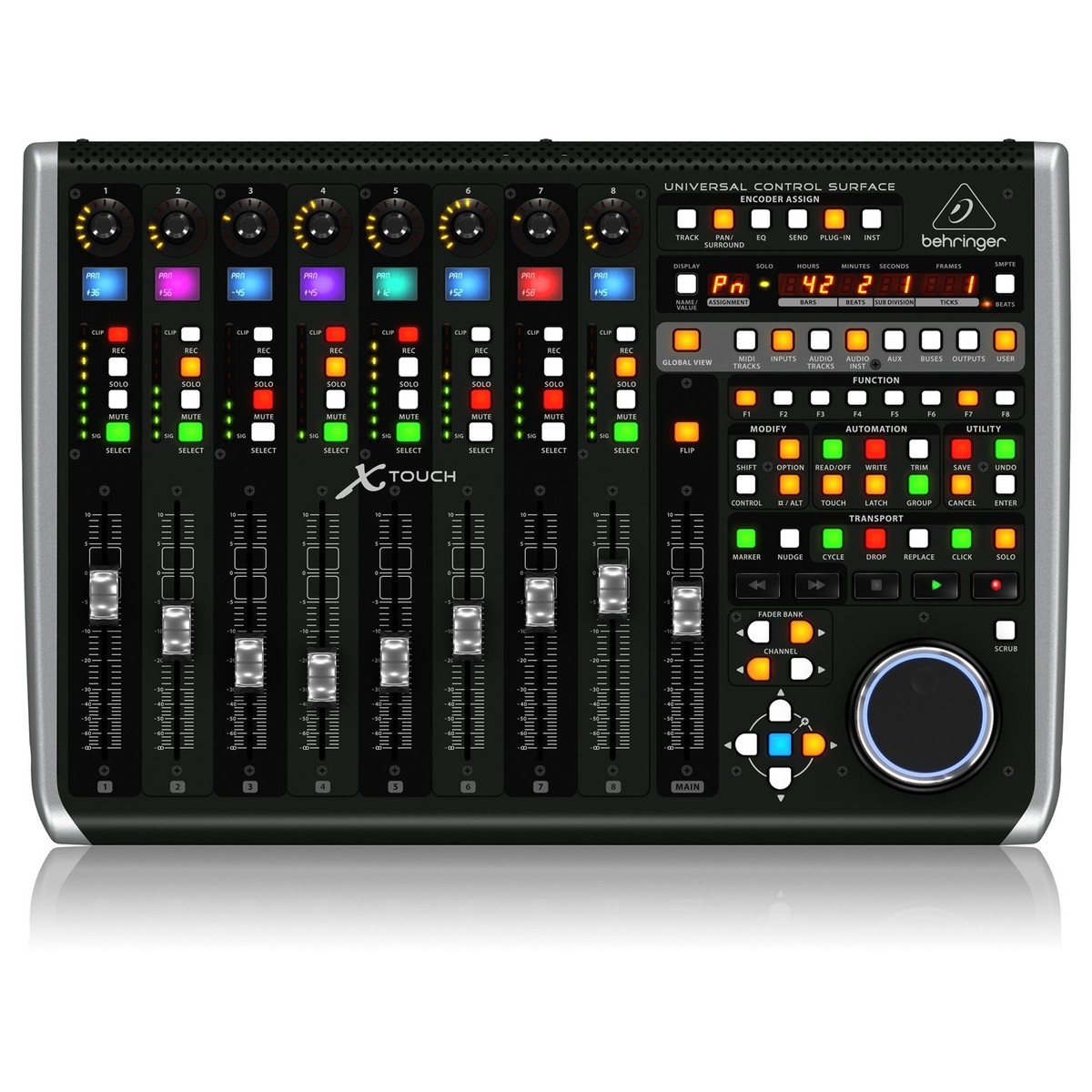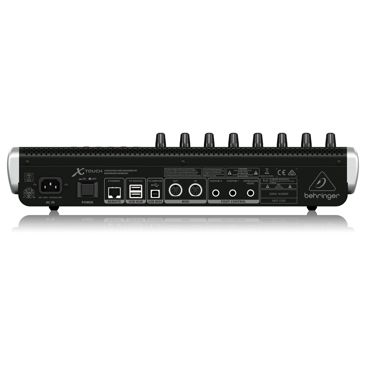 A Superfície de Controle Behringer X-Touch foi projetada para integrar-se perfeitamente com o seu equipamento existente e permite que você expanda sua configuração em ambientes live vivo e em estúdio. Com 9 faders motorizados sensíveis ao toque, 8 faixas dinâmicas de rabisco LCD, 92 botões iluminados e medidores LED de 8 segmentos canal, o Behringer X-Touch fornece controle de precisão e uma visão intuitiva dos parâmetros críticos da mixagem. Completo com uma interface USB MIDI 2x2 incorada, o X-Touch Control Surface pode ser usado com computadores Mac ou PC e um dispositivo MIDI externo.