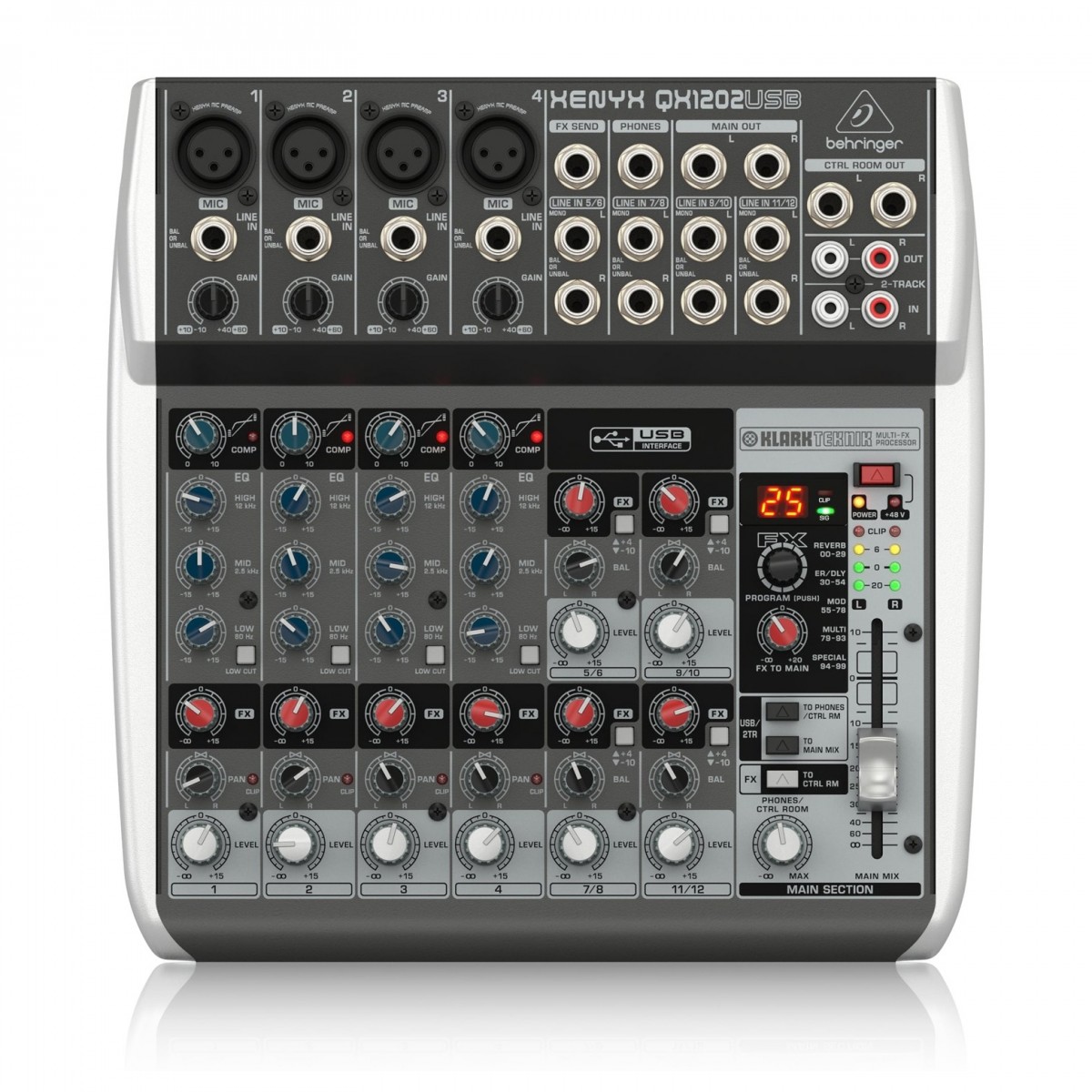• A XENYX QX1202USB é uma mesa de mistura USB construída para oferecer versatilidade e tons de qualidade onde quer que a use. Estas mesas de mistura compactas têm 4 canais mono com premium, pré-amplificadores de microfone XENYX com alimentação phantom, Equalizadores neoclássicos de 3 bandas de estilo Britânico, além de 4 canais stereo. Se necessita de resultados de qualidade feitos com rapidez e precisa que soem fantasticamente, a XENYX QX1202USB é aquilo que procura.