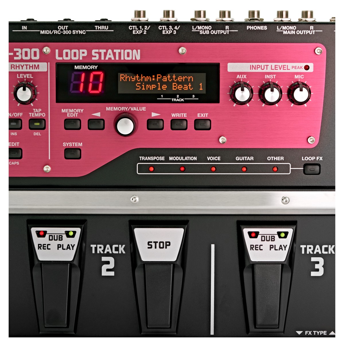 • O Pedal de Efeitos Loop RC-300 oferece-lhe três faixas Stereo sincronizadas com botões de volume dedicados e footswitchyes de transporte-controle para cada faixa e efeitos pro, um Master Pedal de expressão e um painel de controle deluxe ultra-wide para o máximo de controlo e desempenho ao vivo. As entradas XLR com phantom power para microfones condensadores permitem-lhe também fazer loop de vocais.