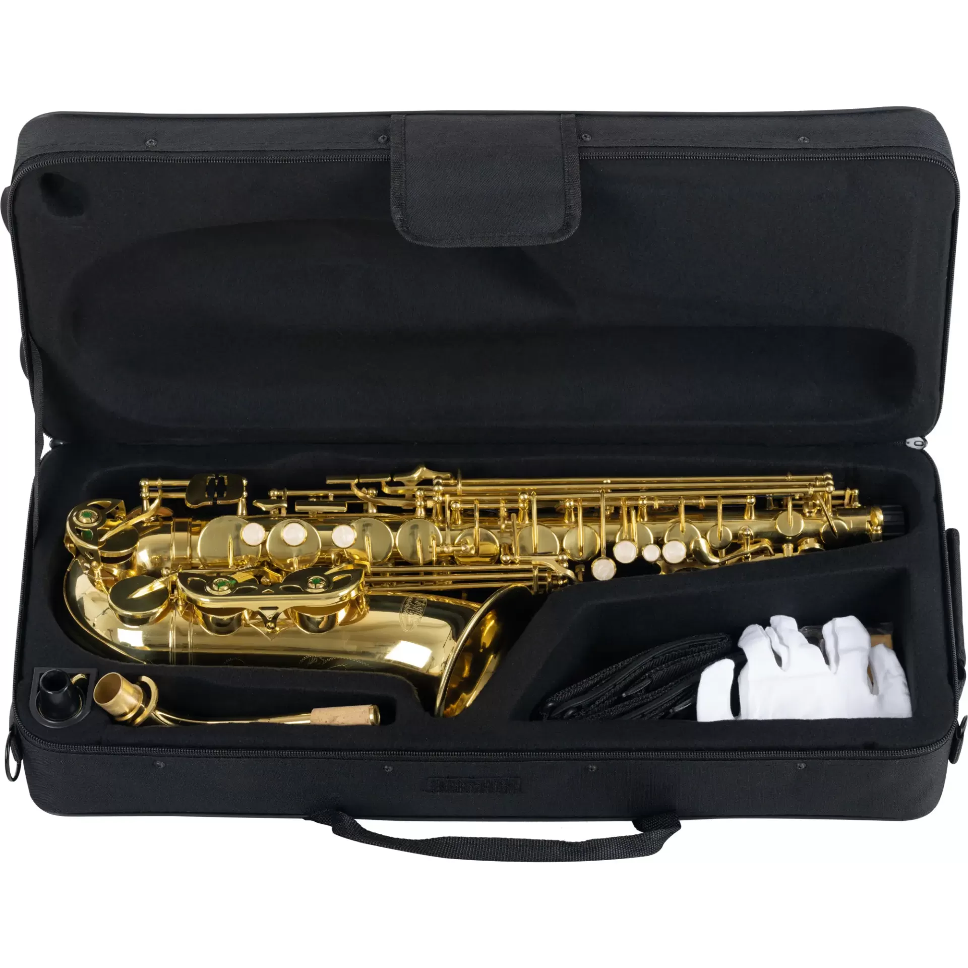 E os extensos acessórios não deixam nenhum desejo por realizar: o estojo leve e durável com compartimentos de armazenamento oferece proteção ideal para o seu instrumento e é prático de transportar como uma mochila! Lá seu instrumento e acessórios encontram seu lugar seguro. A escova incluída mantém o interior do seu saxofone sempre limpo. Um arco em forma de S e um bocal com ligadura também estão incluídos no conteúdo da entrega. Então você pode começar a jogar imediatamente! Um pano de limpeza e um par de luvas também estão incluídos para cuidados.