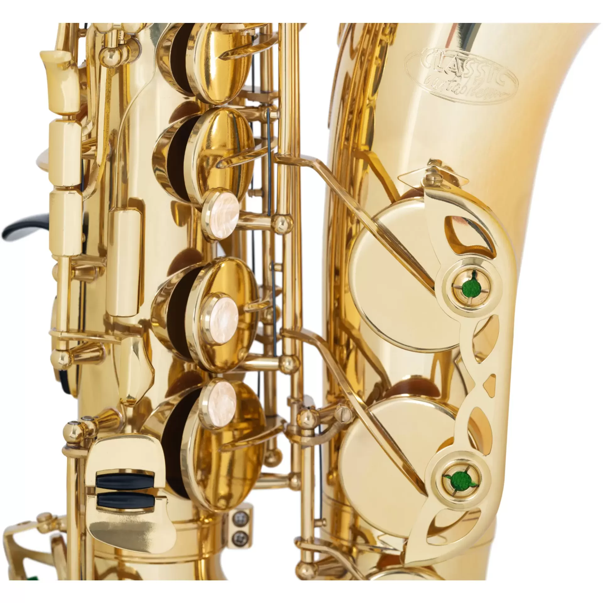 Até a aparência tem muito a oferecer ao saxofone alto AS-450 da Classic Cantabile Brass: O instrumento é feito de latão de alta qualidade e é completamente coberto com uma camada de laca transparente. Os botões de aderência proporcionam um visual elegante em madrepérola e na campainha há um logotipo gravado. Com este saxofone você pode ser visto!