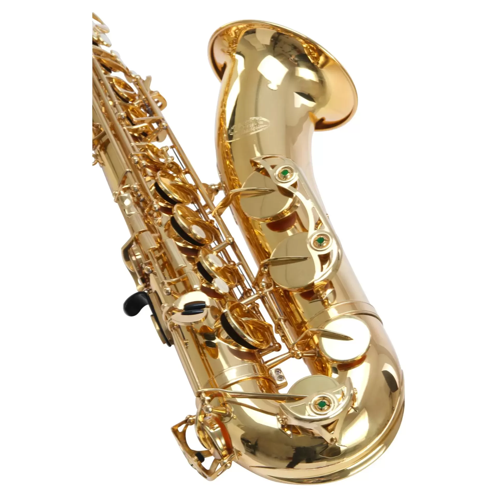 Até o visual tem o saxofone alto TS-450 da Classic Cantabile Brass muito a oferecer: o instrumento é feito de latão de alta qualidade e é completamente coberto com uma camada de laca. Os botões de aderência proporcionam um visual elegante de madrepérola e um logotipo gravado está no sino.
