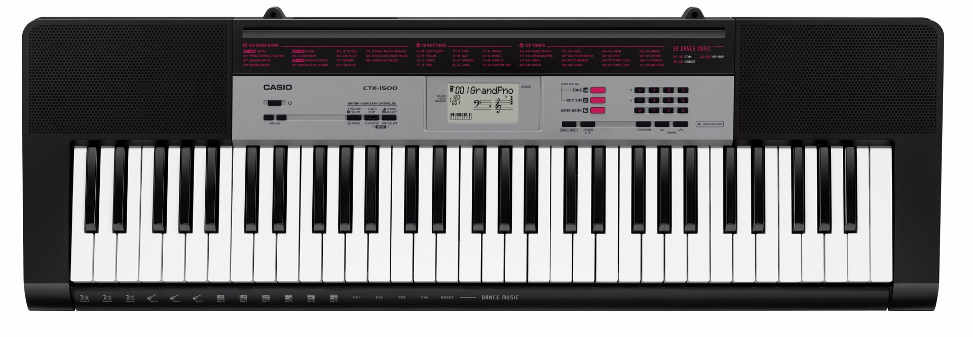 Teclado 61 teclas no estilo piano Polifonia máxima 32 Timbres 120 timbres integrados Ritmos/Padrões 70 ritmos integrados, 50 ritmos de Dance Music Acompanhamento automático Modos: CASIO chord, dedilhado 1, dedilhado 2 (6ª desativada), dedilhado 3 (no baixo), acorde de extensão completa Controladores: Iniciar/Parar, Sincronismo/Preenchimento Músicas integradas 100 (Banco de músicas) Função de lições Lição leve Seleção da parte da lição (mão direita, mão esquerda, ambas as mãos) Repetir Avaliação de desempenho Dedilhado em áudio Outras funções Modo Dance Music Controlador de ritmos/banco de música Transposição de teclas ±1 oitava (–12 a 0, a +12 semitons) Controle de afinação A4 = 415,5 a 465,9 Hz (Padrão inicial: 440,0 Hz) Alto-falantes 10cm x 2 Amperagem de saída 2W+2W Terminais de entrada/saída Fones de ouvido/saída (entrada estéreo padrão) Alimentação externa (9,5V DC) Requisitos de energia Pilhas: 6 de tamanho AA/adaptador CA opcional: AD-E95100L Dimensões (L x P x A) 946 x 307 x 92mm * Exceto suporte de músicas e outras projeções Peso 3,3kg (Sem as pilhas) Acessórios incluídos Estante para partitura
