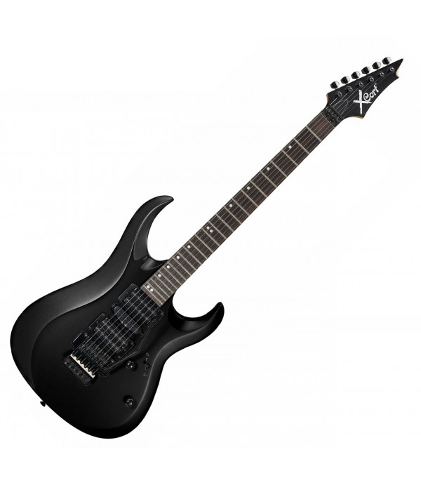 A guitarra X 6 BK da Cort possui corpo em basswood, braço em 5 peças, escala em rosewood, captação Bluebucker BB-2F / BBEG5-M / BB-2R (H-S-H) e ponte tremolo double locking II.