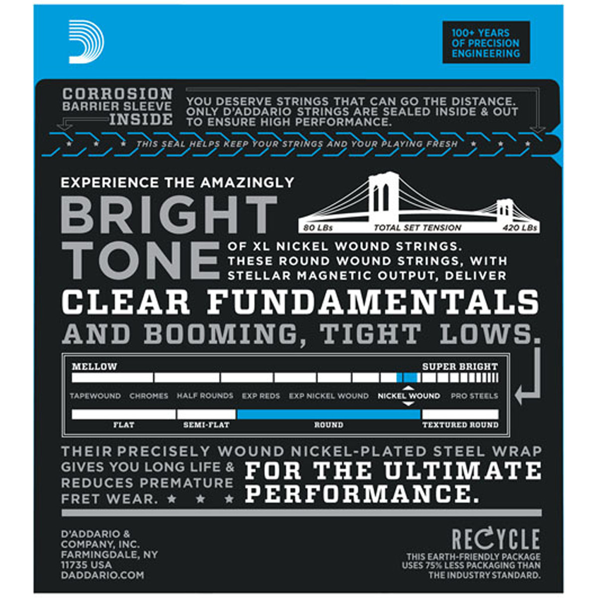 Incrível entonação proporcionada por cordas XL de precisão Versátil o suficiente para acomodar uma gama de géneros e estilos de jogo Tom brilhante distinto resultante de material de aço niquelado Adapta-se a uma variedade de baixos devido ao comprimento da escala de 36,25"