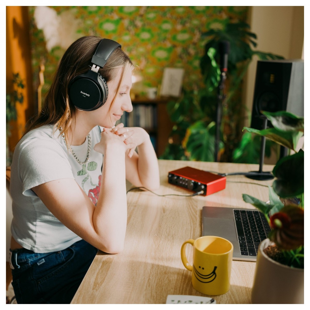 O pacote de gravação de 4ª geração Focusrite Scarlett 2i2 Studio é um pacote de gravação de estúdio completo composto pela interface de áudio 2i2 de 4ª geração, microfone condensador CM25 MK2 e um par de fones de ouvido SH-450 que fornecem qualidade de som rica para monitoramento. O microfone condensador CM25 MK2 emprega um padrão polar cardióide que oferece uma reprodução de som rica enquanto elimina ruídos de fundo indesejados. Monitore seu som com extrema precisão usando os fones de ouvido fechados SH-450, isolando você do mundo ao seu redor, para que você possa se concentrar na tarefa em questão.