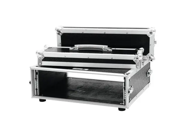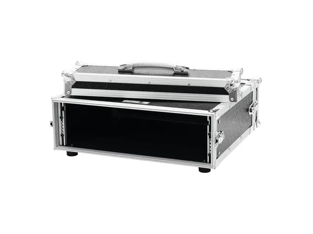 O flight case está equipado com quatro fechos de pressão com ilhós de travamento, trilhos para rack integrados e uma alça de transporte.
