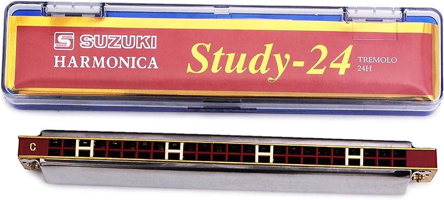 Suzuki Study-24 é uma gaita de tremolo de 24 furos de alta qualidade, feita de trastes de resina inofensivos, possui mola espessa, placa de cobertura de aço inoxidável compacta e durável, belo timbre e construção compacta, marcas de "DO" com cor branca, design atencioso para iniciantes e amantes da música. Características: Linda gaita de tremolo de 24 furos, proporciona um som melodioso e brilhante. Mola espessa para seu desempenho sensível e estável. Adota trastes de resina ecológicos, seguros para tocar e não são fáceis de distorcer. Marcas de "DO" com cor branca para o jogador principal encontrar o lugar do tom de forma fácil e rápida, muito conveniente para tocar melodias complexas. Placa de cobertura de aço inoxidável com alto brilho, construção compacta e qualidade durável para longa vida útil. Fácil de tocar, design humanizado para você mover sua boca suavemente. Especificações: Modelo: Study-24 Material: Resina e aço inoxidável Furo: 24 Chave: C