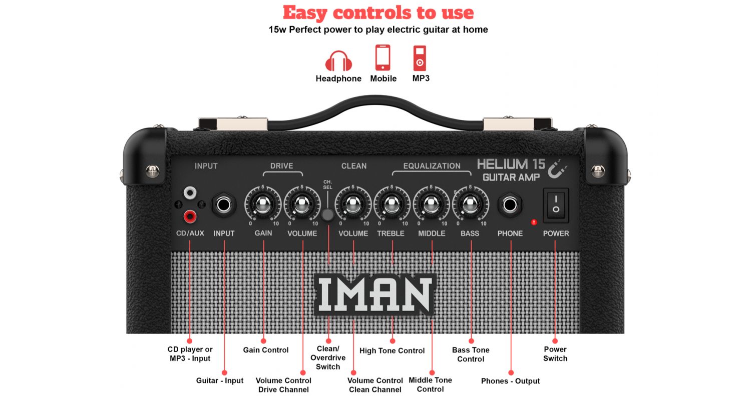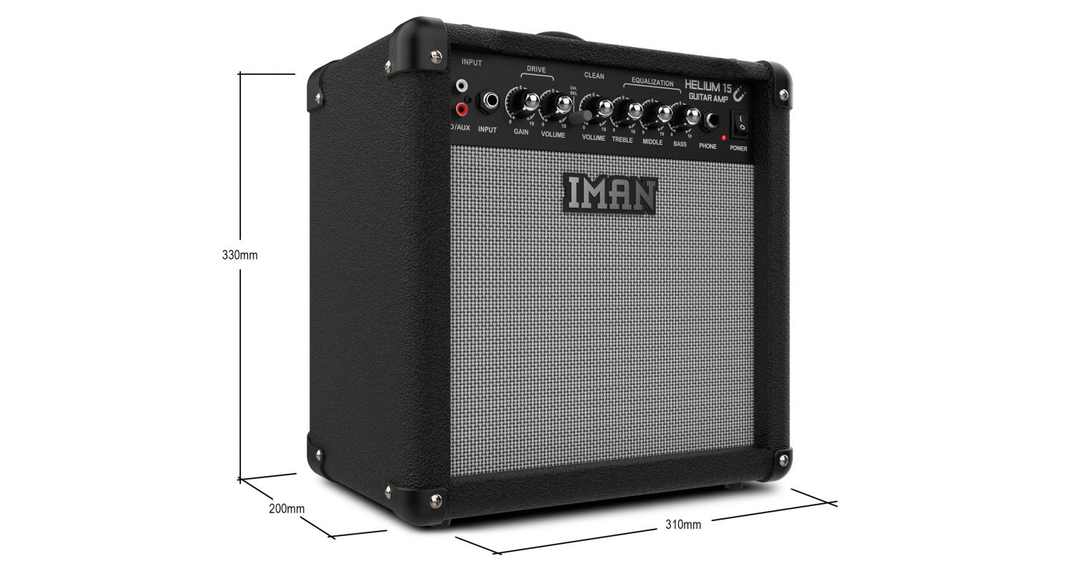 Iman Helium 15 é o amplificador de guitarra eléctrica ideal para quem pretende começar ou para quem necessita de um segundo amplificador ao melhor preço com a qualidade que caracteriza a marca Iman. Pratique suas músicas favoritas em casa graças aos seus 15 W de potência e controles de equalização fáceis de usar, além de ter tamanho e peso ideais para transporte. Possui conexão para fones de ouvido e você também pode tocar uma base musical do seu aparelho através de RCA.