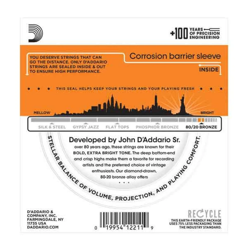 O Bronze 80/20, geralmente referido como latão, foi desenvolvido por John D'Addario Sr. e John D'Angelico nos anos 30 e estabeleceu um padrão. Esta liga é popular para som completo, claro e focado, seja no palco ou no estúdio. Todas as cordas acústicas D'Addario são enroladas em um núcleo de aço carbono hexagonal e oferecem longa vida útil, som claro e excelente entonação.