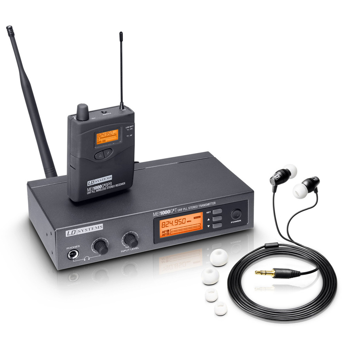 O LD Systems MEI1000G2 In-Ear Monitoring Wireless System proporciona uma monitorização auricular versátil e fiável em que se pode confiar em qualquer evento. O MEI1000G2 pode alternar sem esforço entre as configurações estéreo e mono, permitindo-lhe adaptar-se a qualquer situação áudio. O receptor de bodypack pode funcionar durante mais de 10 horas quando utilizado com um par de pilhas alcalinas de boa qualidade. Ambos os componentes do sistema possuem ecrãs LCD de alta qualidade, o que lhe permite controlar facilmente a energia restante da bateria e os níveis de áudio estéreo.