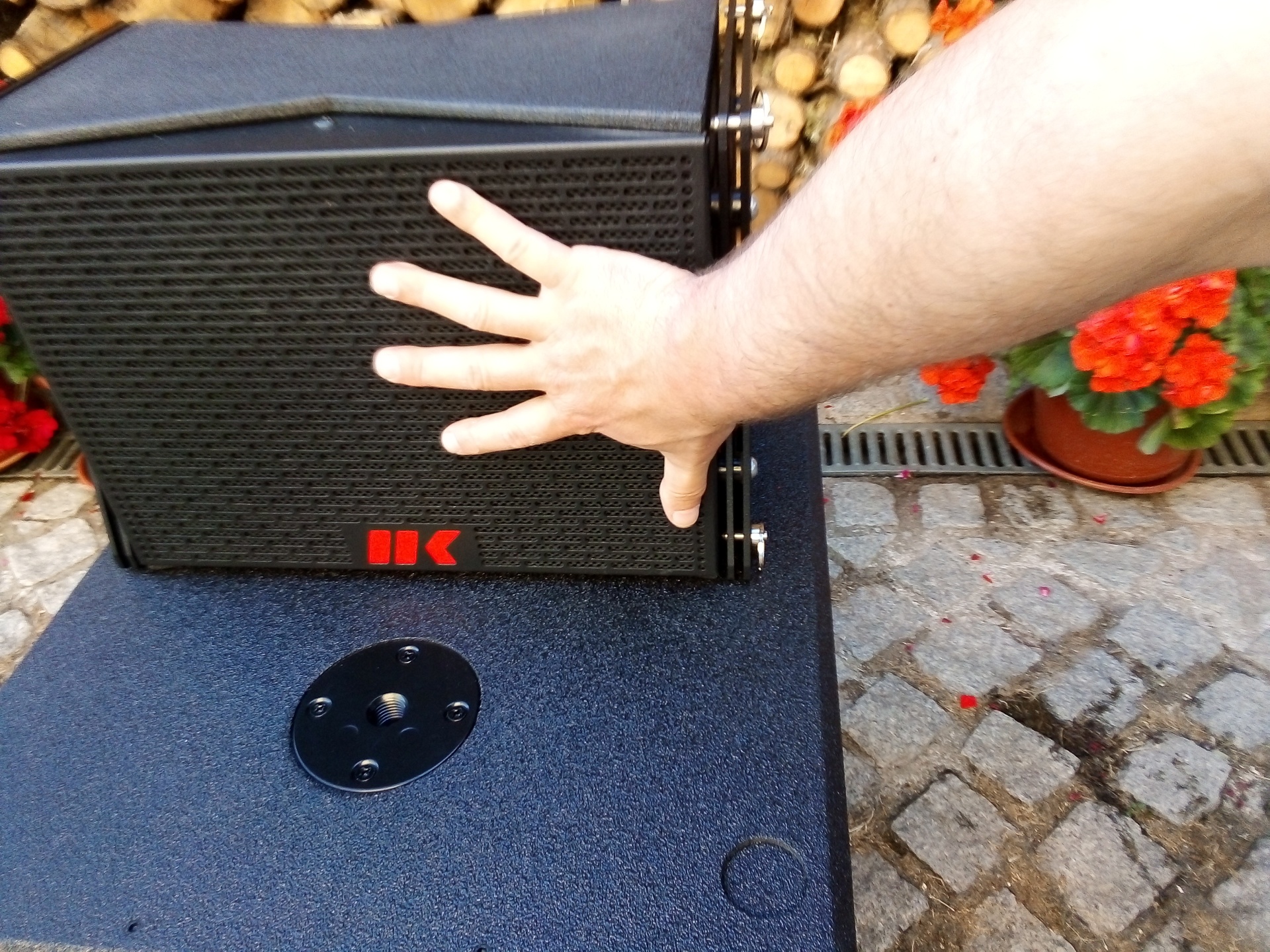 I- Invertendo o sistema de pendurar permite que seja usado como monitor ou simplesmente e de forma eficiente como Side Fill ou Drum Fill.