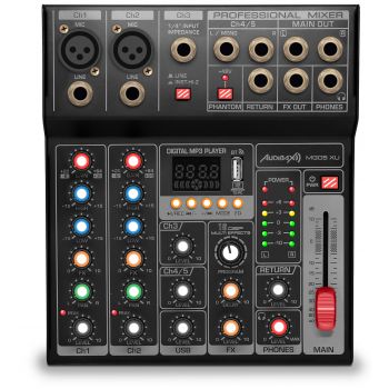 O MG05 XU tem um aviso de pico nos canais principal e de microfone. Um medidor VU completo de 5 segmentos por canal facilitará a mixagem de seus sinais. Inclui um potenciômetro para regular o volume do retorno de efeitos, com o qual você não precisará ocupar um canal da mesa, e o canal do instrumento pode funcionar como um canal de linha mono. A potência de 48v acaba de completar a versatilidade deste novo Audibax.