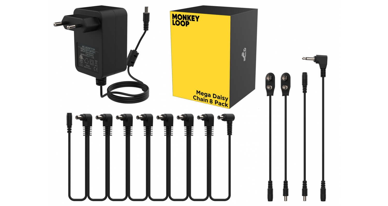 • Esqueça de carregar um adaptador para cada um dos seus pedais com o cabo do pacote Monkey Loop Daisy Chain 8. Um pack composto por um primeiro adaptador de alimentação de 9V e um cabo Daisy chain capaz de alimentar até 8 pedais. Fabricado com materiais de alta qualidade para garantir um tom ideal sem quedas de tensão ou perda de tom.