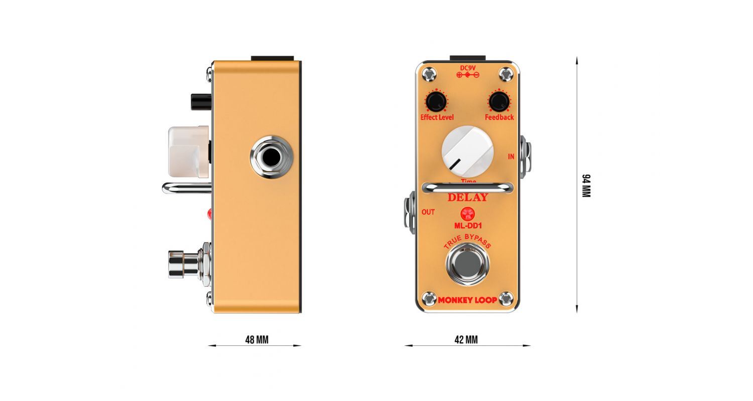 As suas dimensões compactas de 94 mm × 42 mm × 48 mm e o seu peso de 133 g fazem do ML-DD1 um pedal muito fácil de integrar na sua pedaleira, proporcionando-lhe uma ferramenta essencial para adicionar texturas e camadas à sua música. Descubra a arte do “Delay” com o Monkey Loop ML-DD1 e leve a sua expressão musical a novas dimensões.