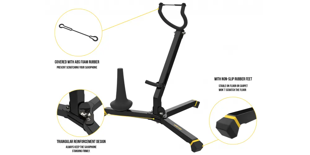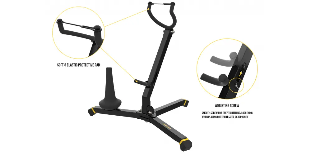 Imagine ter que alternar constantemente entre saxofones alto e tenor. Como evitar que um dos seus instrumentos caia ou arranhe?Este suporte possui três pernas dobráveis com pontos de segurança e acabamento emborrachado para garantir estabilidade. Para segurar o saxofone, ele possui uma extremidade em formato de U que abraça a campana do instrumento. Este suporte possui um suporte que se encaixa entre a estrutura do próprio suporte e o corpo do saxofone. Este suporte pode ser reposicionado para um ajuste preciso, proporcionando uma pegada segura para o nosso instrumento e evitando posturas inadequadas.