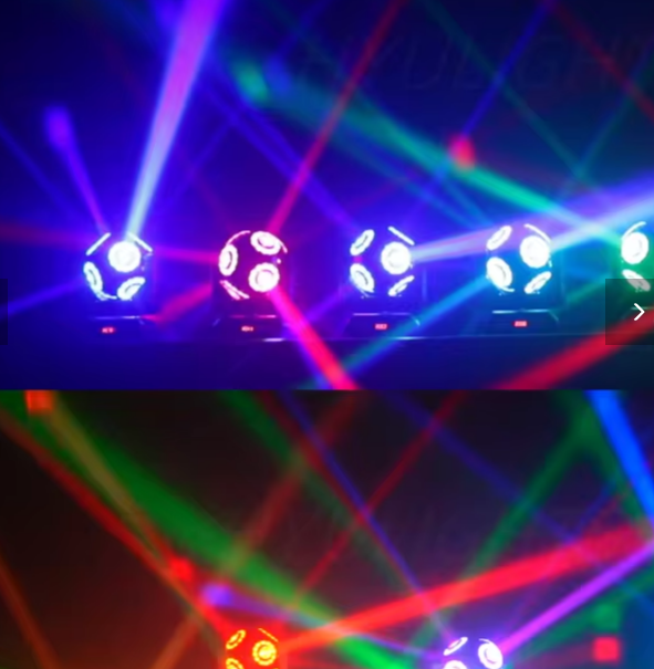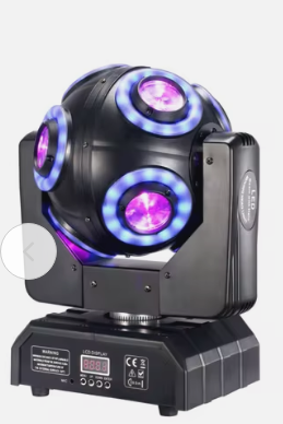 Fonte de Luz: O dispositivo utiliza 8 LEDs de 15W RGBW (vermelho, verde, azul e branco) 4 em 1 para um branco definido e uma mistura de cores completa. Adicionalmente, possui 96 LEDs 5050 RGB 3 em 1 para um efeito de "halo". Movimento: Oferece uma rotação de 540° em Pan e uma rotação infinita de 360° em Tilt, permitindo uma ampla gama de movimentos e efeitos dinâmicos. Controlo: O controlo é versátil, suportando modos DMX 512 (16 canais), automático, som (sound-activated) e Master/Slave. Efeitos: Inclui um strobe com 15 flashes por segundo, dimmer de 0-100% e controlo de cor constante regulado. O design tipo "bola de futebol" (football light) produz feixes de luz concentrados, ideais para efeitos de palco e discoteca. Construção: Pesa cerca de 4 KG, sendo leve e portátil, e é feito para resistir ao uso profissional.