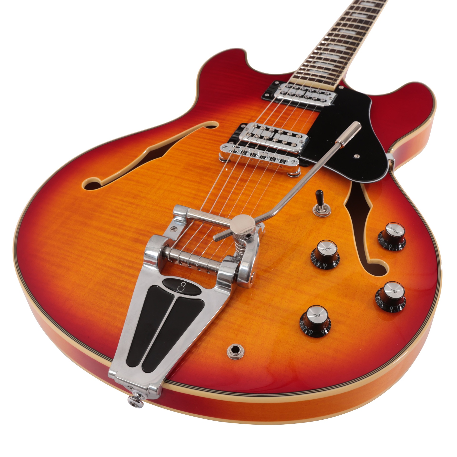 Material do corpo: Tampo: Flame Maple, laterais e fundo: Maple (Bloco central: Maple) ; Forma do corpo: Sire Semi-Hollow Shape ; Cor do corpo: CS (Cherry Sunburst), ; PESCOÇO:: Material do braço: Mogno ; Forma do braço: Em forma de C ; Escala: 24.75” ; Material da escala: Ébano Edgeless™ (Bordos da escala enrolados) ; Raio da escala: 12” ; Trastes: 2,7 mm Medium Jumbo, 22 trastes; Porca da corda: Porca em osso, 43 mm de largura; Incrustações: Bloco quadrado de perlóide branco ; Junta do braço: Braço Set-in ; ELECTRÓNICA :: Captadores: Conjuntos de captadores LC Filtertron ; Controlos: Interruptor de 3 vias, 2 Volume, 2 Tons ; Botões: Botão Top Hat preto ; FERRAMENTAS :: Ponte: Tune-O-Matic e Tremolo “G7” de göldo/sire ; Mecanismo de afinação: Afinador Sire Premium Diecasting ; Acabamento das ferragens: Cromado (CS) ; Proteção da palheta: Preto 3ply ;