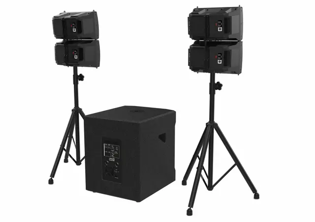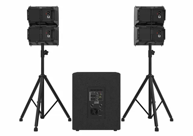 Tipo: Matriz ativa Alto-falante de graves: 18″ Bobina de voz do woofer: 3″ Tipo de driver de alta frequência: Corneta Driver de alta frequência: MF4x6,5″+HF4x Resposta de frequência: 45Hz-20KHz Nível máximo de pressão sonora (dB): 125 dB Tipo de impedância: 4 ohms Dispersão: V 90° x H 120° Montagem: Suporte Tipo de montagem: encaixe de 36 mm, rosca M20 Entradas de microfone/linha: 2 Conector de entrada de microfone/linha: Combo XLR/Jack Entradas AUX: Estéreo RCA Conector de entrada do amplificador: Speakon de 2 pinos Saídas de linha: 2 Conector de saída de linha XLR Processador DSP: Pré-seleção DSP Bluetooth Potência de carga (RMS): HF300W+HF300W Amplificador de potência (RMS): LF500W+HF300W+HF300W Potência máxima de pico (Amperagem): 2000 W Acabamento: ABS + MDF Fonte de alimentação: CA 100V/240V Peso total: 33,93 kg; Peso corporal: 38,57 kg Dimensões: 515 x 610 x 620 mm O pacote inclui:4 satélites + 1 subwoofer ativo 2x 3m Jack/Speakon 4x 30cm Jack/Jack 2 tripés