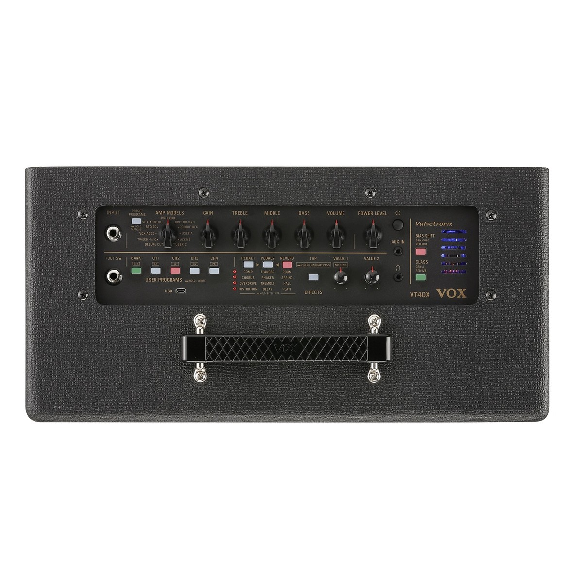 O Vox VT40X Valvetronix Amplificador de Modelação Híbrida de 40 Watts utiliza uma inovadora tecnologia analógica / digital para produzir tons de amplificador incrivelmente realistas e efeitos premium a bordo. Com uma potência de 40 watts, 11 modelos de amplificação, 13 efeitos e um único altifalante de 10 polegadas, o VT40X Combo ultrapassa os limites dos amplificadores de modelação modernos. O Valvetronix VT40X também incora tecnologia VET pioneira, um pré-amplificador de tubo de vácuo e carcaça preta elegante com ta de reflexo de graves.